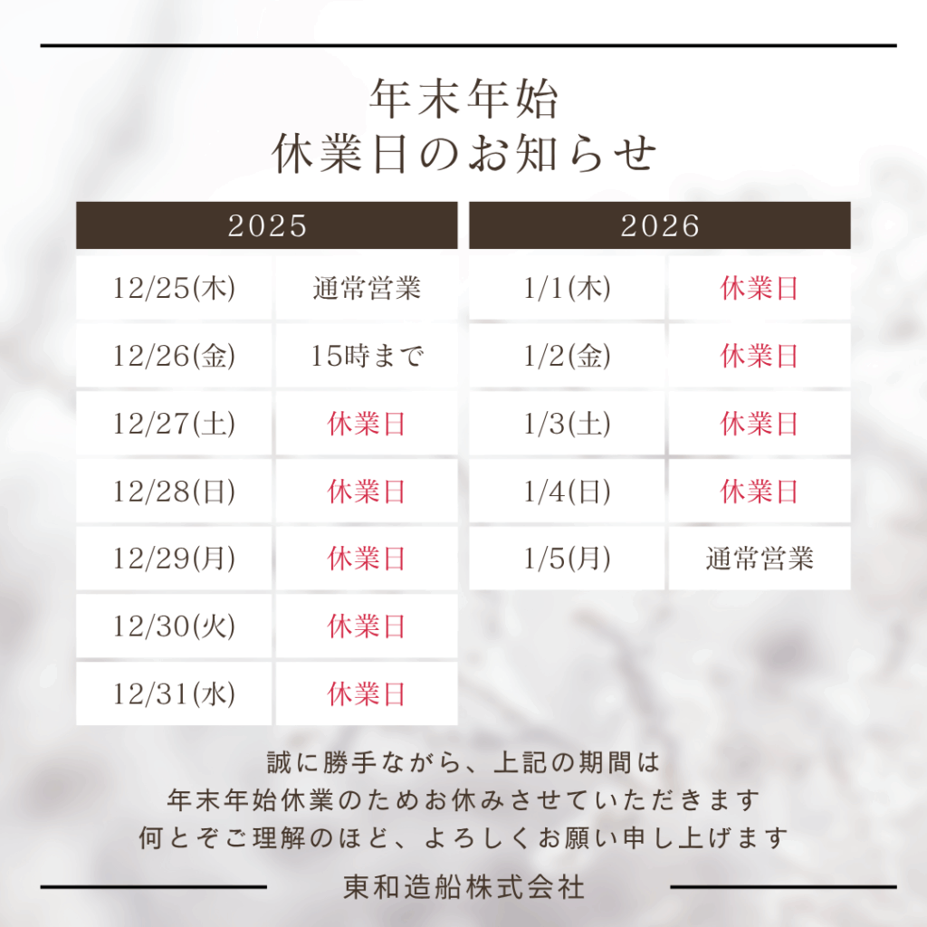 HOME > お知らせ > お知らせ 令和7年度 (年末年始の休業日お知らせ) 2025年12月2日 平素は格別のご高配を賜り、厚く御礼申し上げます 弊社では、誠に勝手ながら、下記の期間を令和7年度の年末年始の休業とさせていただきます ご不便をお掛けいたしますが、何卒ご了承くださいますようお願い申し上げます。 なお12月26日は15時で営業終了とさせていただきます 営業開始は1月5日朝8時からとなります -お知らせ